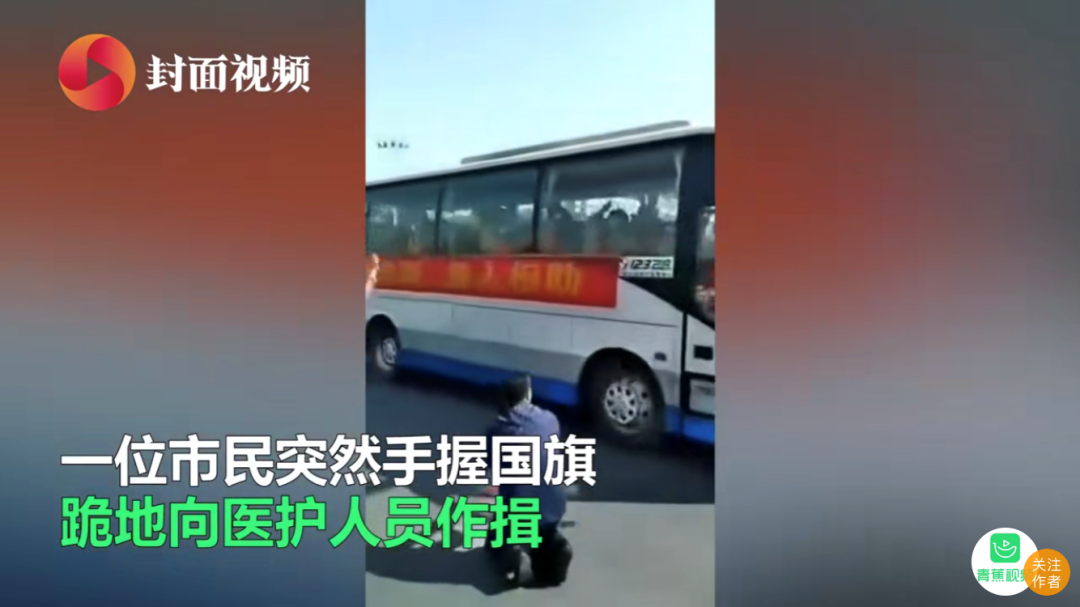 在湖北鄂州,一位市民在街头长跪地送别医疗队,他的家里11口人全部被感染,且有三名重症患者,全部是在医疗队的精心救治下转危为安的。
