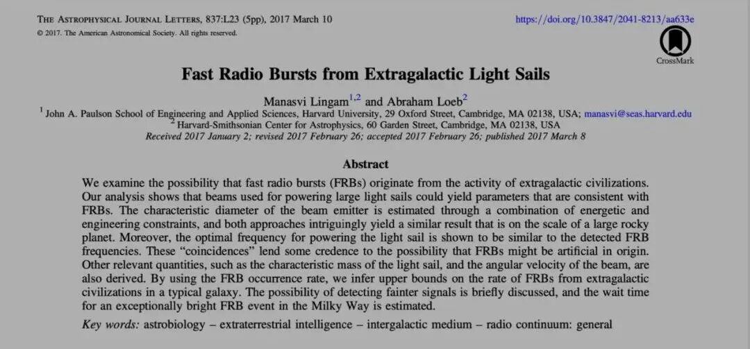 这就给一些科学家想象的空间。哈佛大学天文系的主任Abraham Leob认为,快速射电暴就是地外文明外星人制造的光帆,也就是外星人的动力系统在推动光帆进行星际旅行的时候泄露的能量。 这种能量要非常高才行,如果这个能量不高的话,没法推动光帆,因为光帆也非常大,可能要像地球这么大的光帆才行。而要想推动这么大的光帆,你需要高功率的能量机制。他认为,快速射电暴可能是这种能量机制泄露出来的。