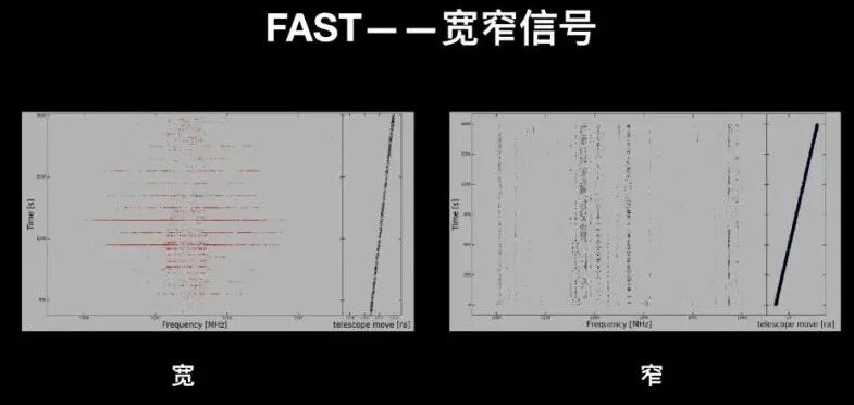 上面两张图就是在FAST望远镜上对地外文明观测的实际数据。这两张图左边是个宽带信号,大部分都是地球上的干扰,比如说雷达的干扰、飞机的干扰,手机的干扰,左边这些窄带信号是我们筛选出来的,有可能是地外文明发出的信号。