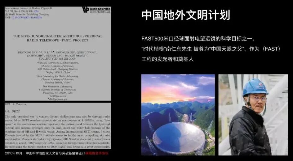 天眼之父南仁东先生与他的论文 这是中国最早论述观测地外文明的一篇文章。基于文章,基于我们和伯克利的观测合作协议,2018年,伯克利地外文明研究小组和我们共同在FAST望远镜上装了一个后端设备,我们就开始了观测。