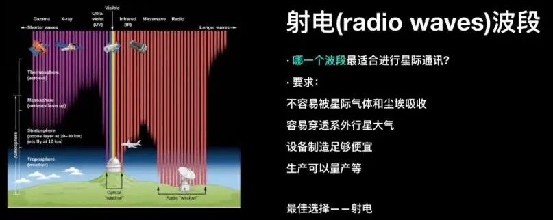 我们需要找的这个波段,它必须不容易被星际气体吸收,外星文明发过来的时候,它能穿越中间的那些星际气体和尘埃。再就是它能够穿透我们的大气层。其实设备制造非常容易简单,就像我们电视机,卫星接收天线,手机等等。 所以说射电是我们最佳选择,但是射电波段里面什么信号是外星文明的信号呢?
