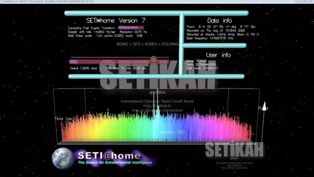 SETI屏保程序 观测的数据量很大,要甄别排除射电干扰、人类造成的干扰等,光凭这几个小组成员也很难做到,所以伯克利SETI研究小组发展了一种方式,开发了一个处理数据的屏保。任何一个人的计算机闲着的时候,屏幕保护就可以用来处理这些数据,处理完了数据自动发回伯克利。
