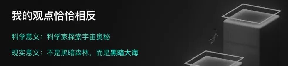 物理学家霍金也曾警告过人类,不要盲目地去主动和外星人接触。 但是,他们这些观点实际上是基于我们地球资源有限,文明和文明之间必须因为资源而相互杀戮的前提条件下推导出来的。现在是在整个宇宙中来寻找地外文明——整个宇宙足够大,不存在争夺资源的事情。 所以我的观点和他们完全相反——想象一下,如果在一个狂风暴雨的漆黑大海上,你驾驶一艘船,在远处发现一点星光,是来自另一艘帆船的,这时候你是拿出枪来把他干掉,还是说找到他,互相帮助、互相依存?