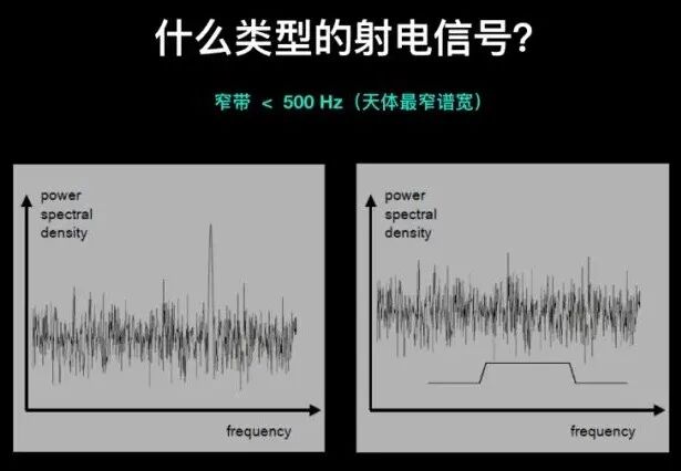 上面是一些人工模拟的信号示意图,左边这个很尖的就是一个很窄的信号,右边是宽带信号。 小于五百赫兹的窄带信号,我们人类很容易制造出来,所以我们在进行观测的时候,要区分、去除我们地球上人类制造的这种窄带信号,需要很复杂的程序甄别。