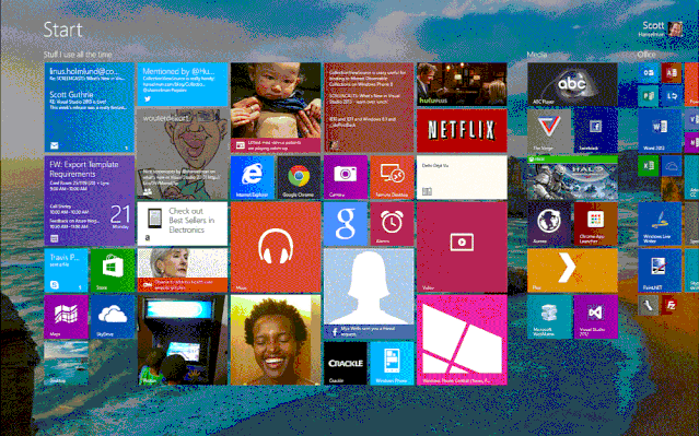 微软的想法是,方块的 Metro 设计改善了触摸体验,方块内部的空间也可以拿来显示通知或者预览,让用户不用点击就获取应用中的消息,将原本封闭的消息通知放在桌面上,提高系统的生产力。