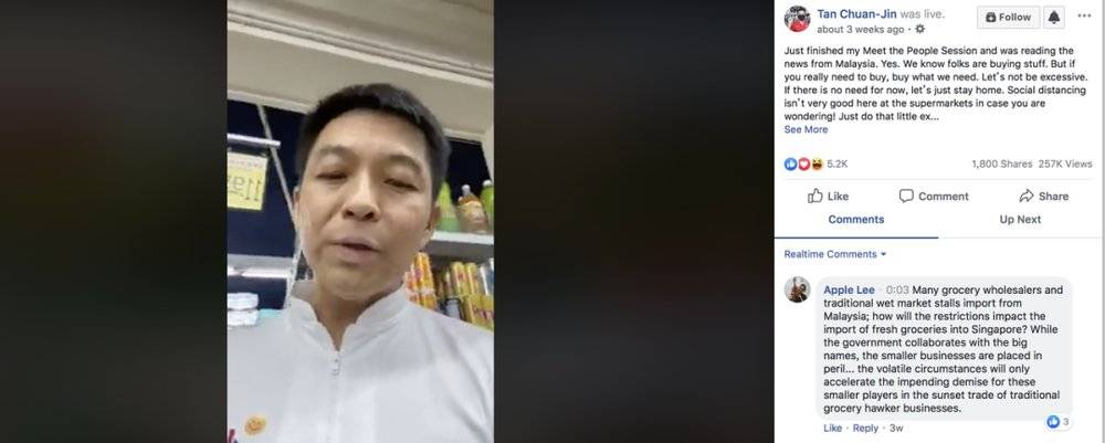 当时新加坡政府为安抚超市哄抢一空的现状,国会议长陈川仁来到Fairprice做20分钟直播,新加坡职工总会(NTUC)秘书长黄志明次日也向新加坡人保证,NTUC食物囤货非常充足。