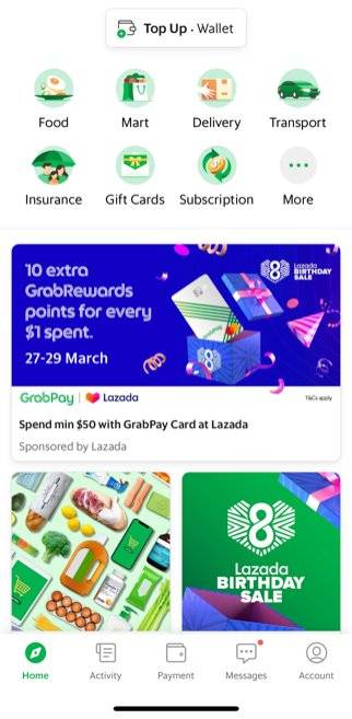 当时在Grab的应用里有一个分类是Groceries,不过现在这一栏已经变成Mart。在新加坡版Grab App里,Grab Mart入口已排至第二顺位,仅次于Food,而Transport(打车)功能已被顺延到了第四位。