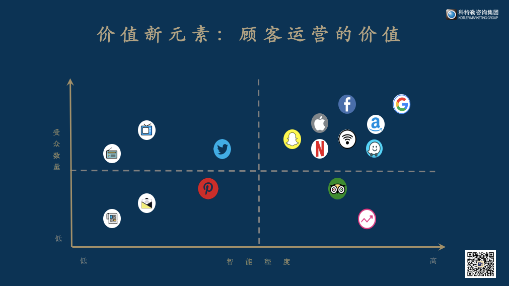 第一个观点,站在顾客的角度来讲,营销已经进入了4.0时代,一个顾客资本主义的时代。企业价值,是全部顾客价值的净现值;顾客终身价值的增长,是企业增值的根本来源。