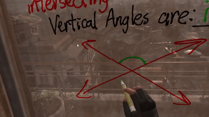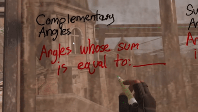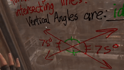 显然,Charles Coomber的VR教学尝试很成功。受到激励的他开始挖掘更多的虚拟现实教学应用,他还在VR软件中讲起了勾股定理,这一次自由度更高,黑板都可以自己涂抹出来: