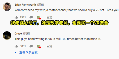 尽管用VR设备写字比较吃力,但也得到了观众的的高度评价: