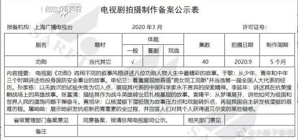 记者初步统计,目前已经备案的项目中,献礼题材数量达到11部,仅次于市场中盛行的都市题材。其中,郑晓龙联合其他七位剧集大导执导的献礼大剧《功勋》,最受市场关注期待。全剧分为《于敏》《申纪兰》《孙家栋》《李延年》《张富清》《袁隆平》《黄旭华》《屠呦呦》8个单元,每单元5集左右,拟定40集。