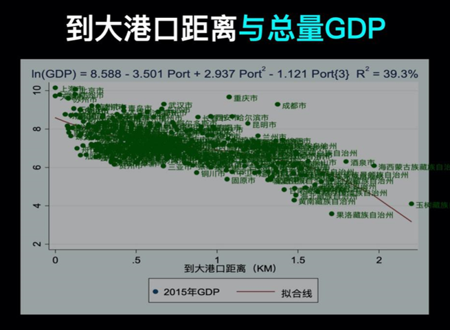 我给大家看一张图,横轴是中国的一些地级市到沿海大港口的距离,纵轴是这个地级市的GDP规模。大家发现什么了吗?图上右侧越远离大港口的一些点,它的GDP规模就越小。而且我们在统计上有一个指标,就是我在图的右上角标注的R平方,代表中国地区之间GDP差距接近40%。它就由一个变量决定,就是你们看到的这个到大港口的距离。