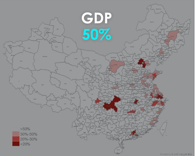 我们把中国的城市按照GDP规模从高到低进行排序,排到这些红色区域的地级市占到中国GDP50%的时候,我就停下来,然后把它们在地图上标注出来。大家可以看到,这些红色的色块,尤其是颜色比较深的部分,就集中在中国的东部沿海地区,尤其是长三角、珠三角地带。如果到了中西部地区呢?带有红色的部分基本就是中国省会级的大城市。