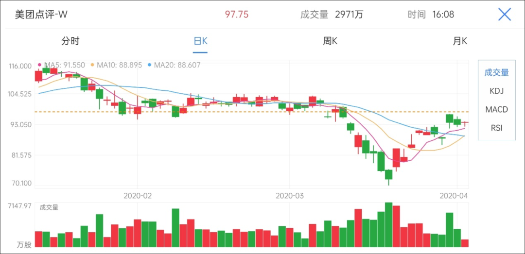 截至4月14日港股收盘,美团股价报收于97.75港元,这与其1月15日时的114港元行情已有差距。