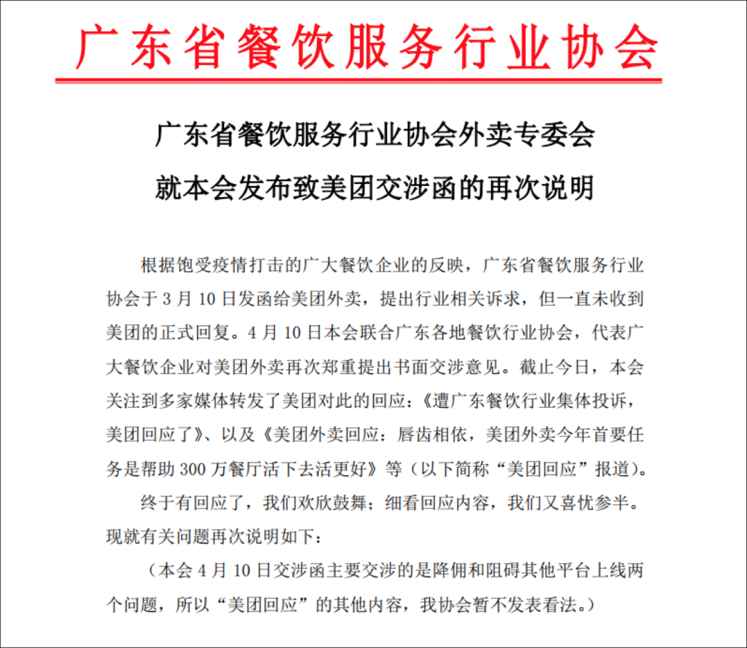4月初,广东餐饮业联名向美团发布《广东餐饮行业致美团外卖联名交涉函》,指责美团作为平台的高佣金及独家垄断,强调高佣金超出商家承受能力;美团于4月13日回应表示,美团对80%企业抽佣在10%-20%范围内,“真实数字远低于各种传言和想象”。