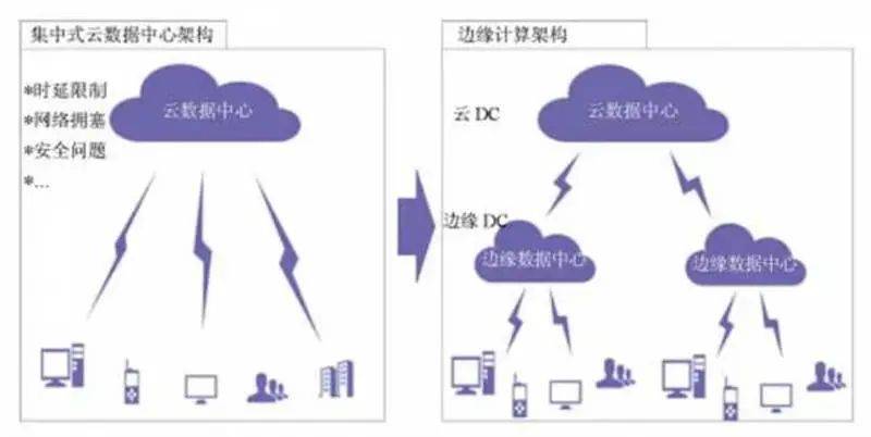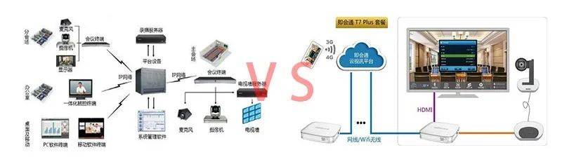 传统硬件视讯系统(左)与云视讯系统(右)架构的对比