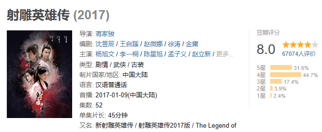 她最近一次出现在观众的视野中,是作为17版《射雕英雄传》的编剧。这部剧最终在豆瓣上取得了8分的成绩,打破了金庸剧翻拍必扑的定律。