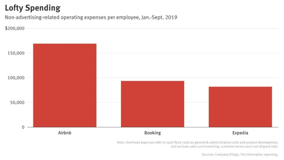 目前,Airbnb 已经暂停了几乎所有的市场营销开支,估计每年节省 8 亿美元。但它可能需要进行更大幅度的全面成本削减。Airbnb 此前高投入换业绩高增长。它在产品开发、设施和员工薪酬等固定成本上的支出,远高于 Booking 和 Expedia 等竞争对手,大概是 Booking 的 1.8 倍、Expedia 的 2 倍。