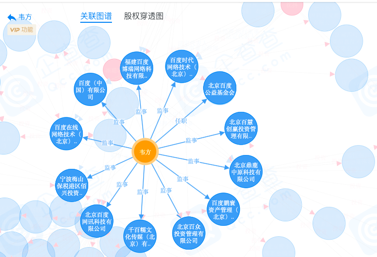 4月21日,天眼查提供的数据则显示,韦方在包括北京百慧创赢投资管理有限公司、北京百众投资管理有限公司、百度(中国)有限公司等在内的15家百度相关企业担任监事等职务。此外,共有两条股权出质信息,质权人均为北京小度信息科技有限公司,出质股权数额198万元。
