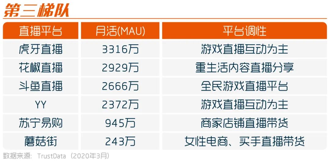 第三梯队中以游戏直播和电商平台为主,游戏直播主要是虎牙、斗鱼和YY,游戏直播平台的主要流量来源还是游戏直播。