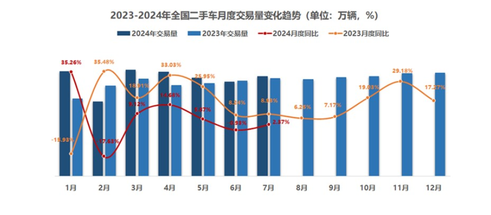 随着新一轮汽车“以旧换新”政策落地,近期二手车市场在交易量和交易价格方面有所复苏。根据乘联会数据,2024年7月,全国二手车交易量为160.94万辆,同比增加2.37%;二手车交易价格较6月份增长0.07万元。