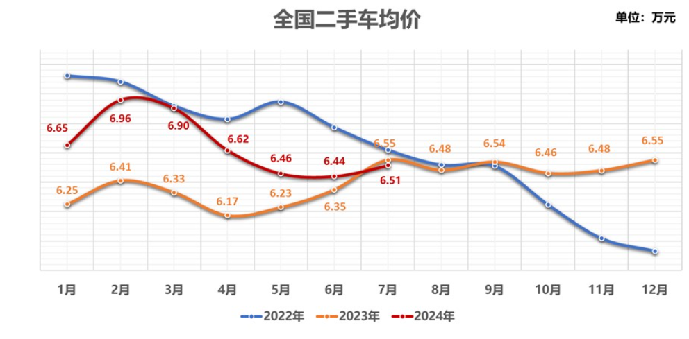 根据乘联会的最新数据,2024年3月份之后,二手车价格一路走低,7月份价格较去年同期下降0.04万元。