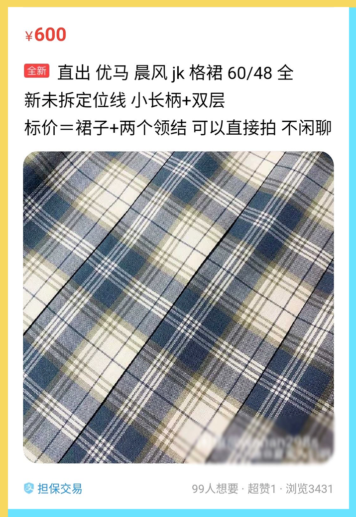 高价的市场行为是多种因素导致的。量少、难等、不好买,有的格裙甚至因为布料原因而绝版不再贩卖,“爱而不得”的JK们只好转而在闲鱼上求购,高价的风气也就因此而来。