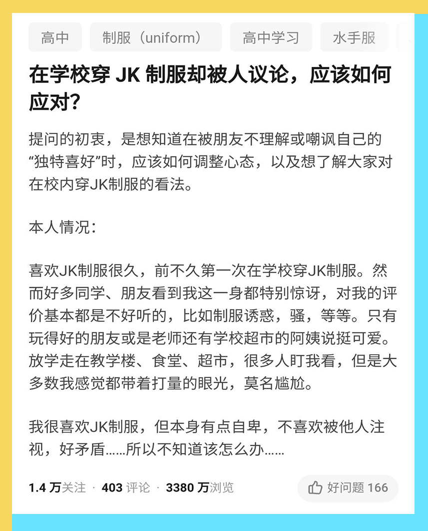 在知乎相关话题的讨论中,和新阳有相同困惑的女孩不在少数。这些来自周遭的评论让这群热爱JK制服的姑娘纠结了:我该怎么办?