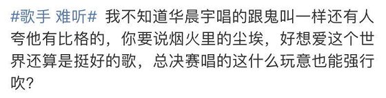 正是因为这些关于审美鄙视链的冲突,使得华晨宇的路人风评极速下降,场面之激烈快要赶上吴亦凡、蔡徐坤当时被主流网友集体diss。