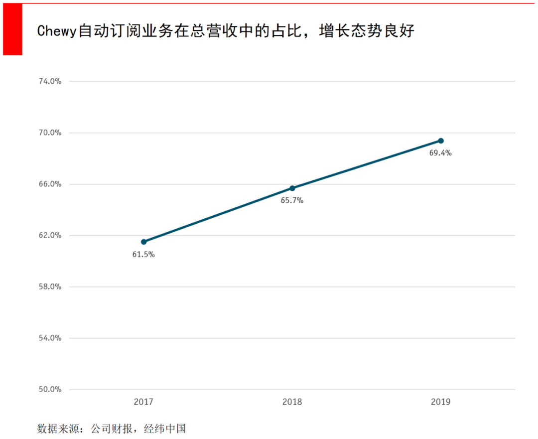 虽然不怎么赚钱,但Chewy之所以能够成功上市,一方面是因为在垂直赛道的龙头地位,另一方面源于商业模式的高度可预测性,这依靠Chewy特殊的“订阅式购买”。