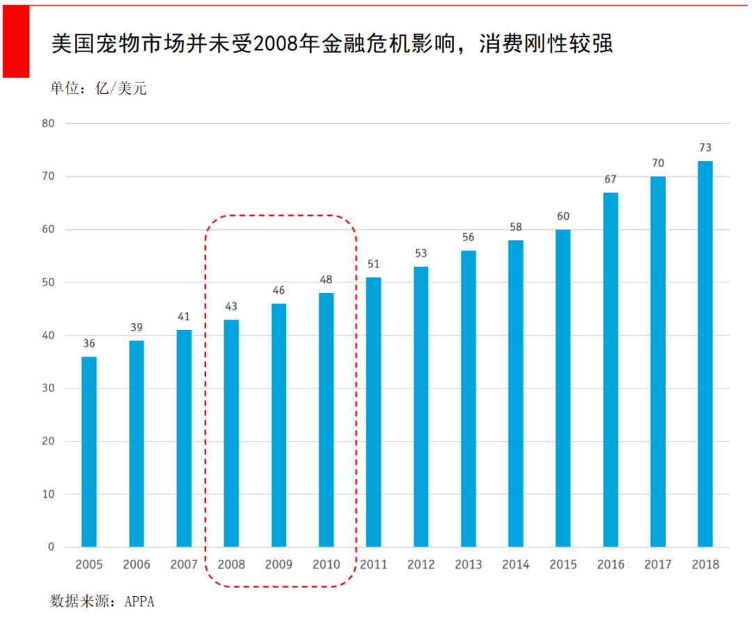 宠物消费受经济周期的影响很小,即便在2008年金融危机期间,美国整体消费支出下降,但宠物消费支出依然在上涨。