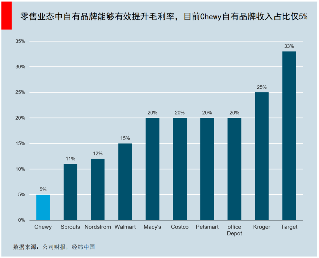 电商平台的自有品牌,毛利率通常比第三方产品高出10%~20%,如果Chewy的自有品牌到2022年可以从现在的5%扩展到10%,毛利率则可以提升100个基点。在宠物行业中,平均而言自有品牌占总收入的20%~25%,Chewy也将向这个方向靠拢。
