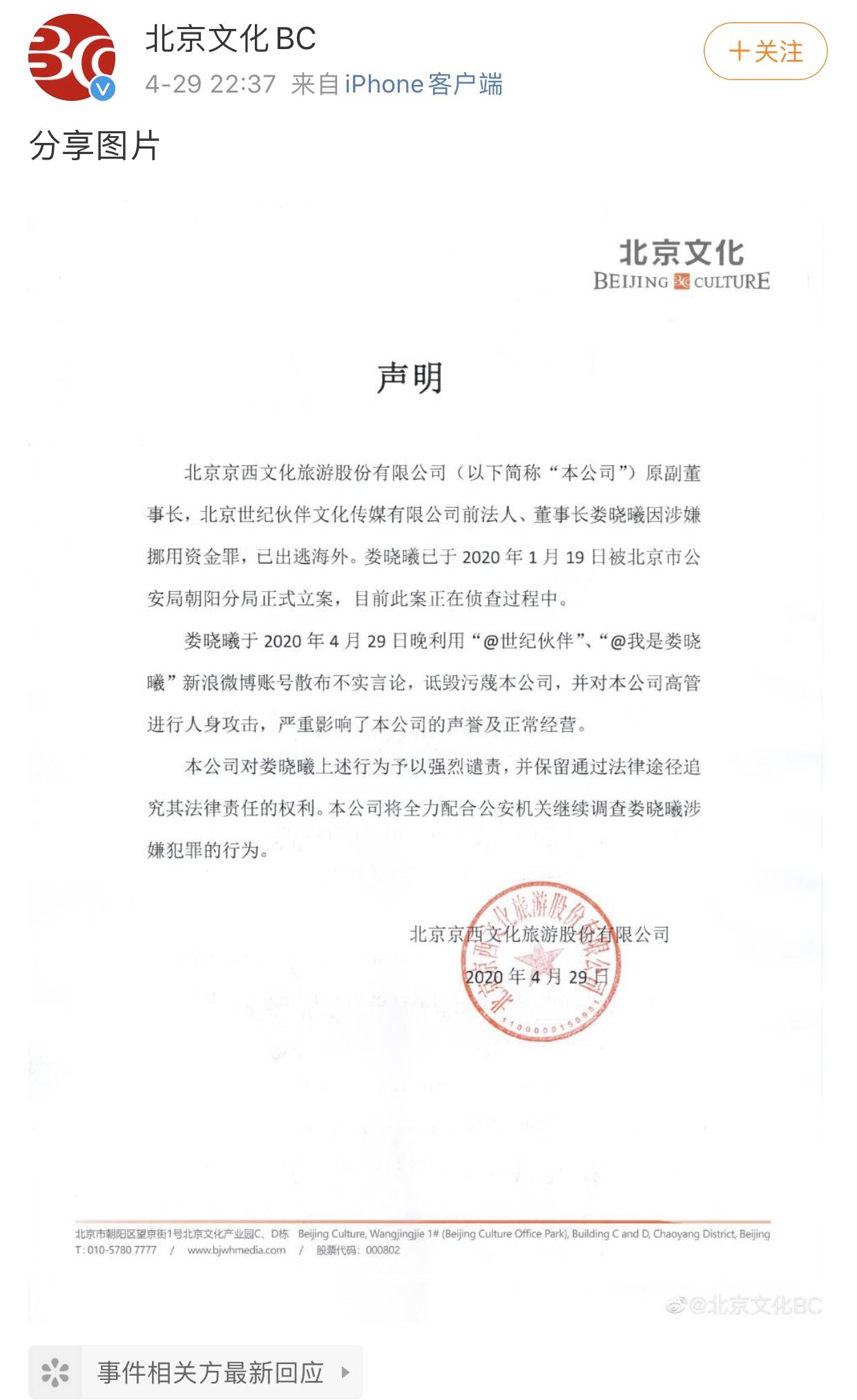 4月29日晚间,北京文化发布声明称,公司原副董事长娄晓曦因涉嫌挪用资金罪,已出逃海外。娄晓曦于1月19日被北京市公安局朝阳分局正式立案,目前此案正在侦査过程中。娄晓曦利用新浪微博账号散布不实言论,诋毁污蔑公司。公司对娄晓曦的行为予以强烈谴责,并保留通过法律途径追究其法律责任的权利。