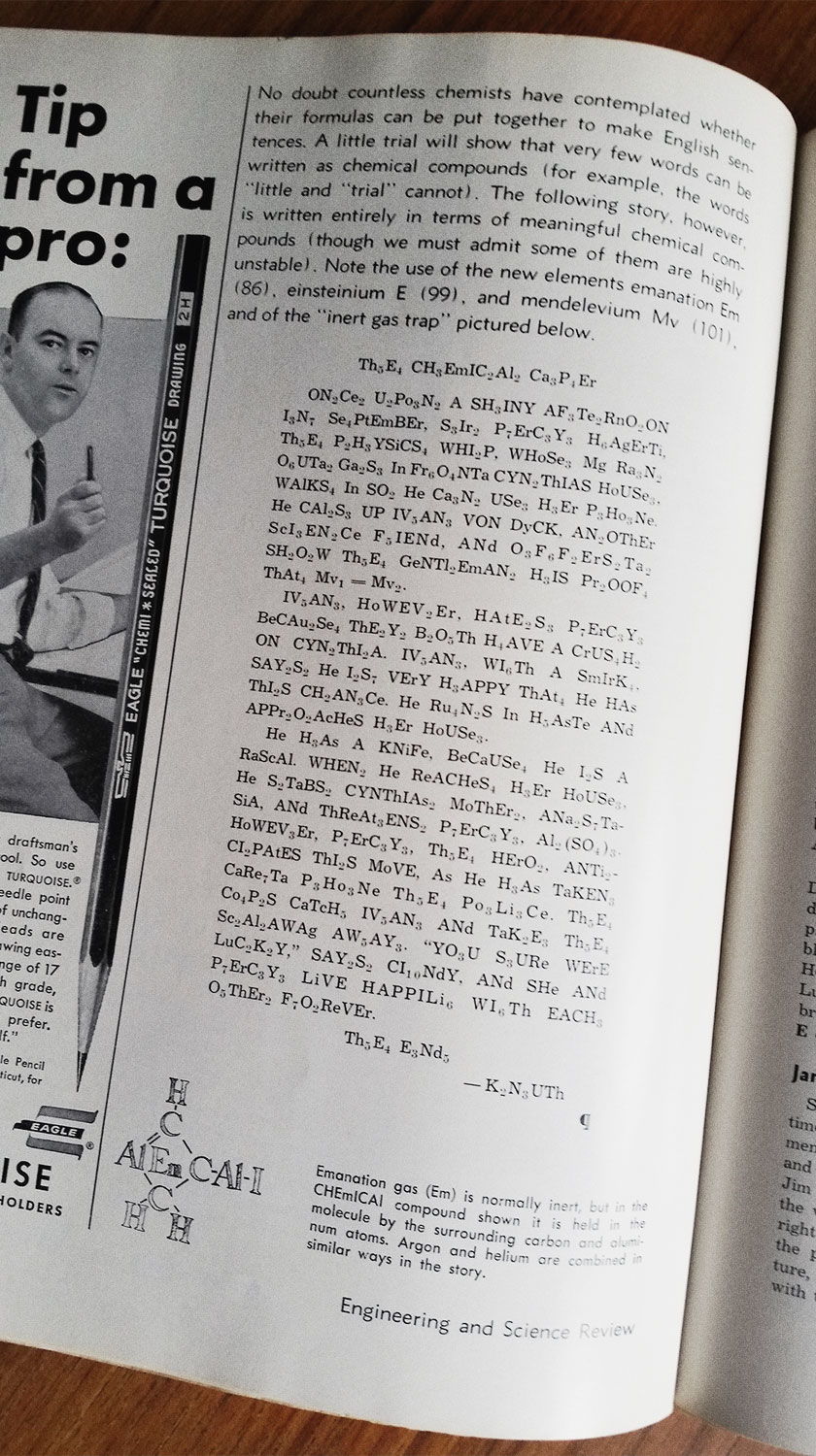 上六年级时,我和几个朋友在一台油印机上写了两页的文章,不过内容全是笑话。上高中时,作为新闻报编辑,我每周一晚上都要通宵达旦赶稿子。上大学时,我作为校刊编辑写了自己的第一行文字。在大学三四年级时,我们开始写工程和科学评论。举个例子,我写了《Th_5E_4 CH_3EmIC_2Al_2Ca_3P_4Er》,其中每个词都是一个化学式。