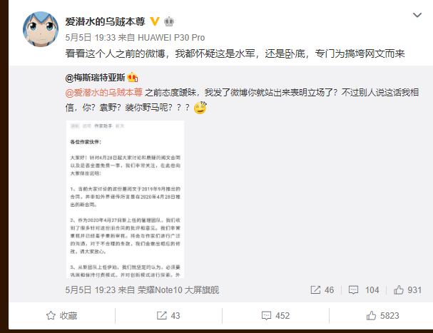 但混乱已充斥于这个已经成长20年的行业,5月4日,就在阅文强调付费战略不变,表示将在5月6日召开作家恳谈会之后1天,号召百万作者罢工的“5月5日断更节”,突然在网上流传开来,把矛头直接从解决合同中的权益问题,转向阅文公司。