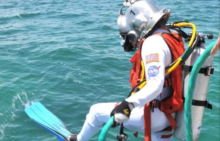他们还要测试月球疏散系统,其中最大的挑战就是,这些宇航员的水下行动要戴着32磅的重型头盔,60 磅的潜水装备,脖子和背部再施加20磅的额外重量,只为模拟月球上遇到的巨大压力。