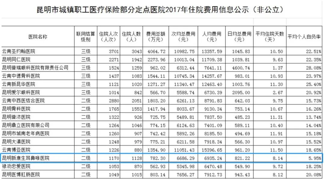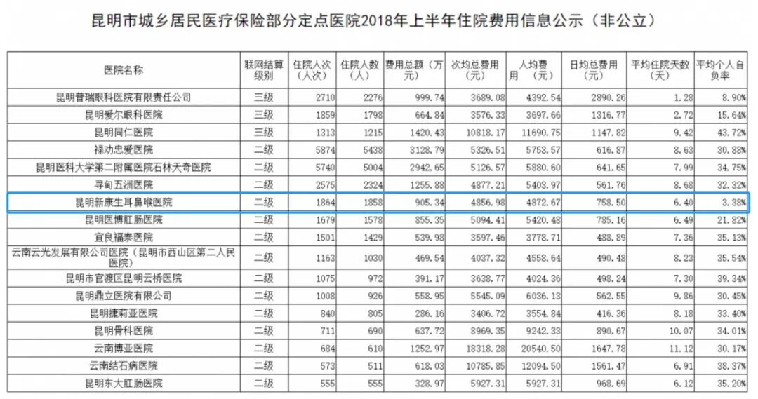 昆明市2017、2018年上半年部分定点医院住院费用信息公示