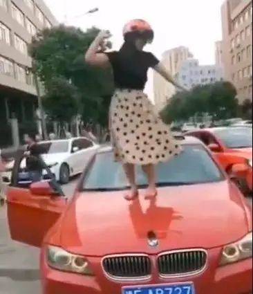 动感音乐下,头戴头盔的女人在红色宝马上赤脚舞蹈,周围是一圈好奇的看客。