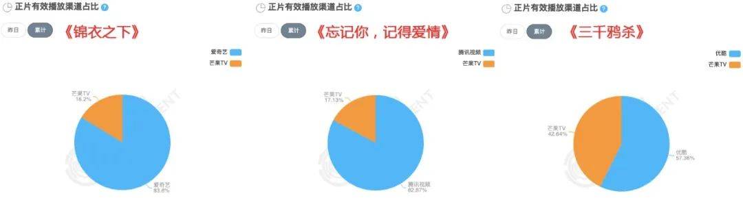 而会员数、日活用户的差距还影响着平台的市场占有率。根据云合数据的正片有效播放渠道占比显示,芒果TV与爱奇艺拼播的《锦衣之下》,渠道占比为16.2%:83.8%;与腾讯视频拼播的《忘记你,记得爱情》渠道占比为17.13%:82.87%;与优酷拼播的《三千鸦杀》渠道占比则为42.64%:57.36%。