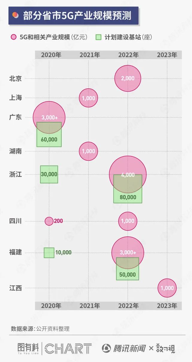 以工信部发布5G商用牌照的2019年6月为时间节点,各地纷纷出台三年期限的产业规划。比如北京市提出,到2022年,北京市运营商5G网络投资累计超过300亿元,实现首都功能核心区、城市副中心、重要功能区、重要场所的5G网络覆盖。浙江、四川、福建等省也纷纷出台了2022年的5G相关产业规模相关规划。