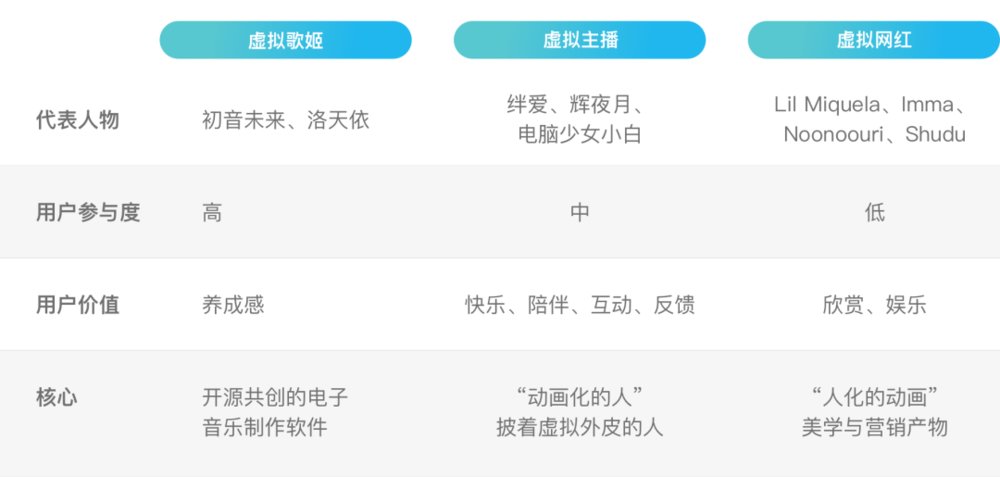 现有头部虚拟偶像主要有虚拟歌姬、虚拟主播、虚拟网红三类。虚拟歌姬因为用户提供了创作价值和养成感而受到喜爱,后两种提供了娱乐和审美价值,这与人类主播、人类网红并无本质差别,只是技术进步允许人们创造出理想形象。