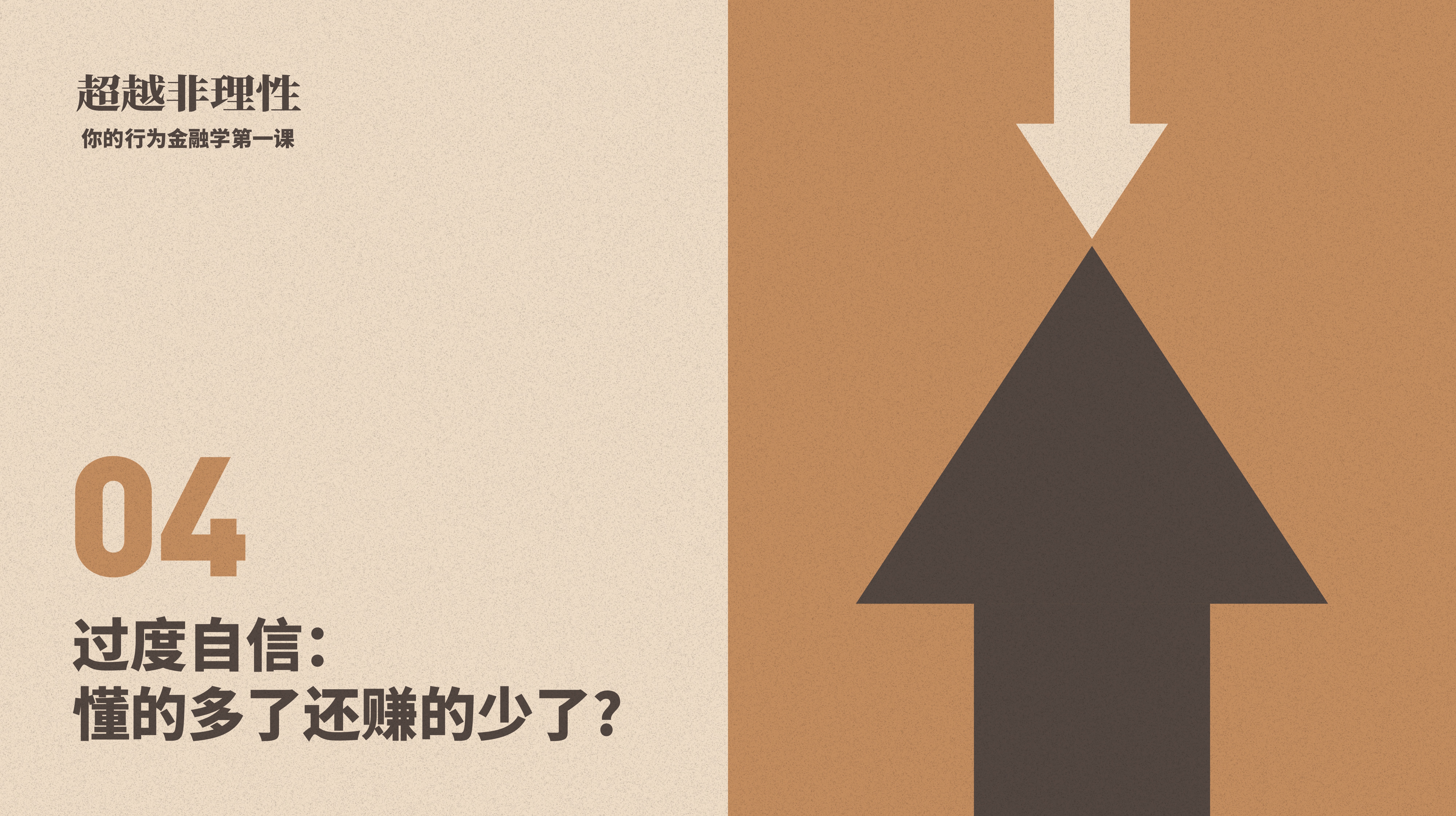 在一个缺乏客观评价标准的领域里,人们普遍存在过度自信的现象。过度自信对于投资者而言有何影响?哪些因素导致人们在投资领域往往出现过度自信的情况?散户如何才能赶上大盘的表现?本期我们来聊聊,投资者应当如何避免因过度自信而影响投资决策。往期视频:投资是“反人性”的吗?带你入门行为金融学为什么在投资中不能盲目追涨杀跌?股票亏了要不要卖?股民为什么不愿及时止损?