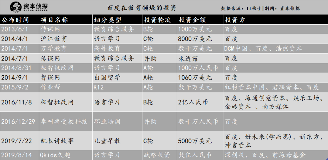 百度的投资版图则从2013年开始,侧重少儿数理逻辑训练和题库产品,偏中早期投资,除作业盒子、凯叔讲故事外金额不高。