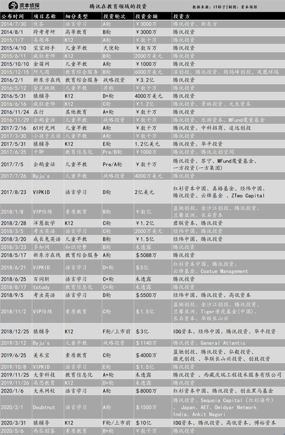从投资数量和金额来看,腾讯是要在教育领域深耕的。据IT桔子统计,腾讯在教育领域的投资总共40起,金额达到36.48亿元,在K12、学前教育、素质教育、教育信息化等领域均有布局,中后期投资居多。