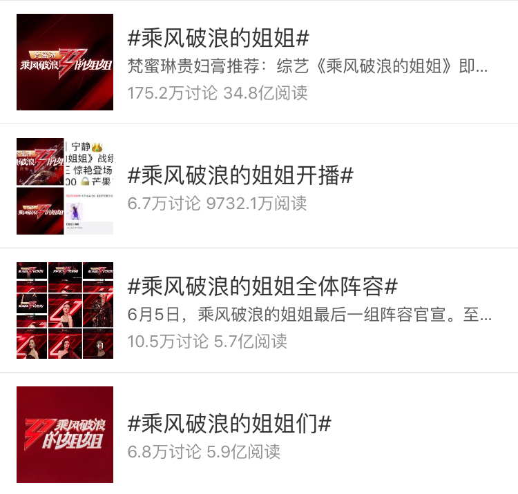在无预热宣传、微博热搜暂停的情况下,《乘风破浪的姐姐》无预警地成为了2020年最大综艺黑马!短短5个小时内,#乘风破浪的姐姐#话题阅读量从12时30分的31.6亿,直接飙至34.8亿,#乘风破浪的姐姐开播#话题阅读量也达到9732.1万。截至6月15日20点30分,《乘风破浪的姐姐》这档综艺在芒果TV的播放量已超4.1亿次。