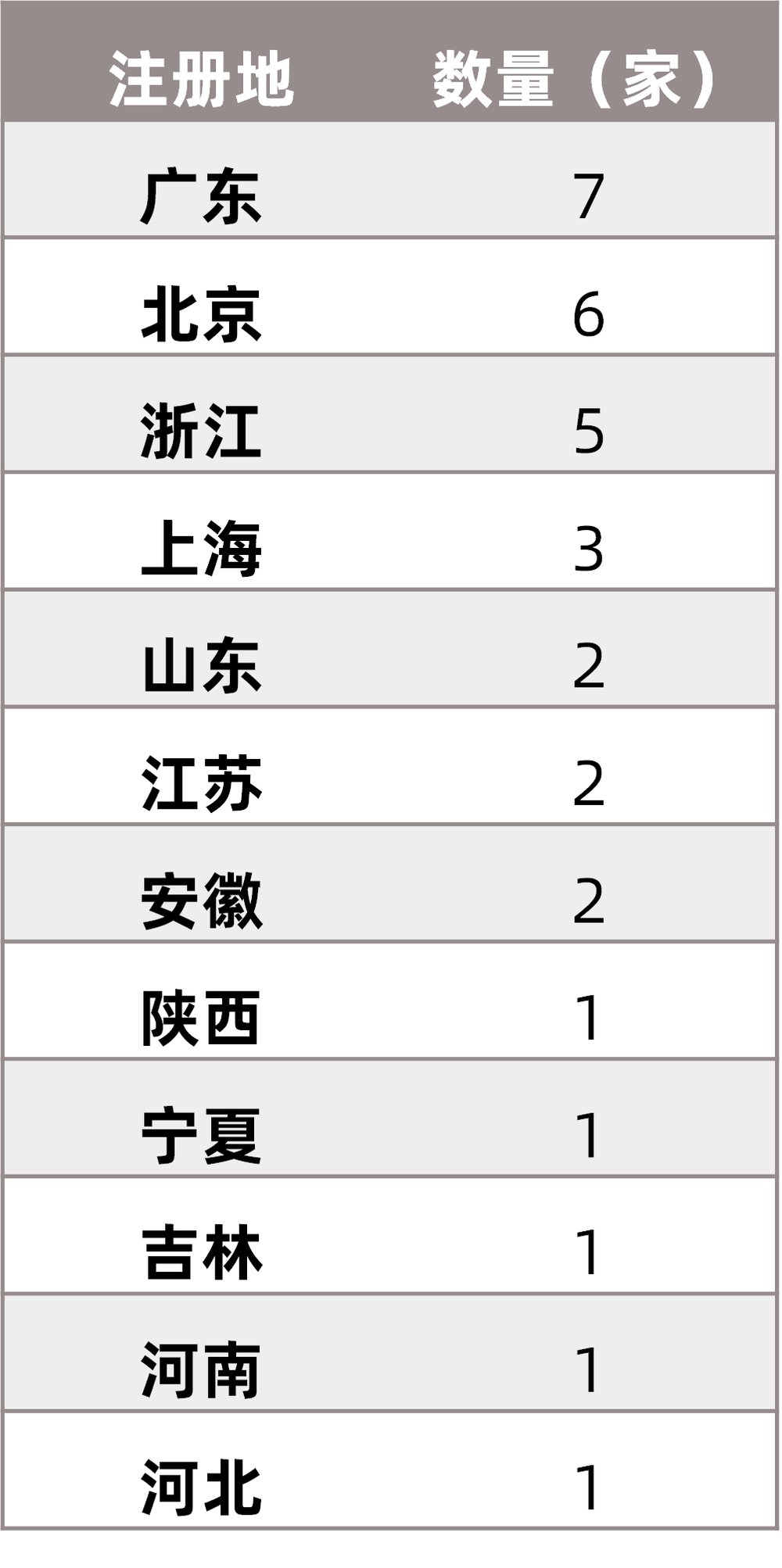 从注册地来看,这些企业主要集中在广东、北京、浙江和上海,分别有7家、6家、5家和3家,注册地在广东的企业约占首批企业的五分之一。