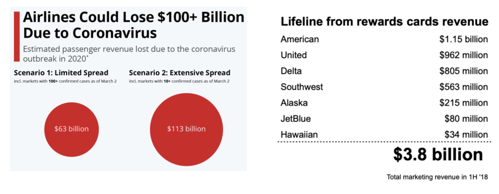 一些数据显示,在2018年上半年,美国大型航空公司在预售里程方面就得到了38亿美元的收入,考虑到2020年新冠肺炎的预计收入损失可能达到630亿到1,130亿美元,那么航空公司很有可能再把“卡”这项业务给捡起来。