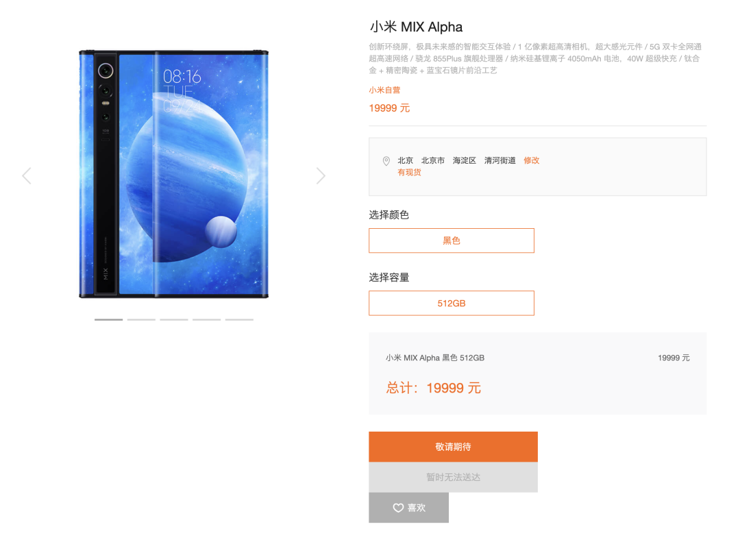 不过,或许是因为手机的结构和屏幕都是采用全新的方案,技术工艺上仍有不少难题,原定于去年 12 月上市的 MIX Alpha ,至今仍只有 19999 元的售价,尚未公布上市日期。