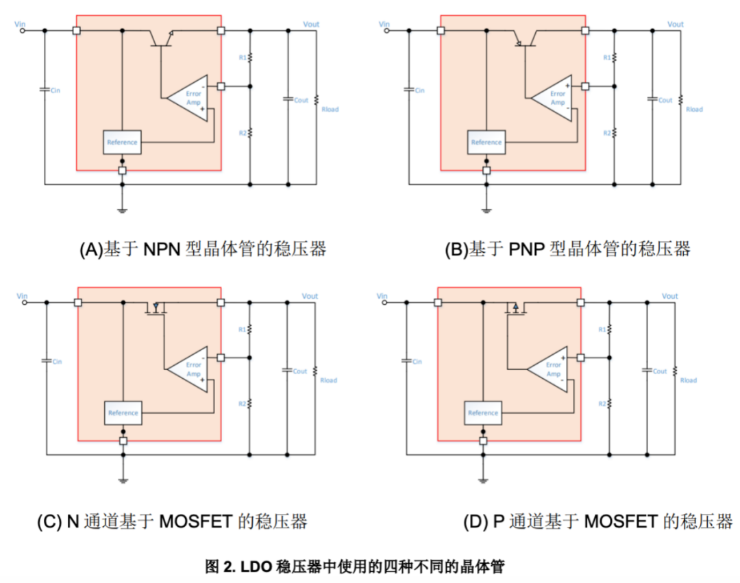LDO稳压器设计通常包含四种不同的通路元件:基于NPN型晶体管的稳压器、基于PNP型晶体管的稳压器、基于N通道MOSFET的稳压器和基于P通道MOSFET的稳压器。虽然说NPN、PNP晶体管型稳压器压差比MOSFET型更高,但是MOSFET静态电流(Iq)明显低于晶体管稳压器。