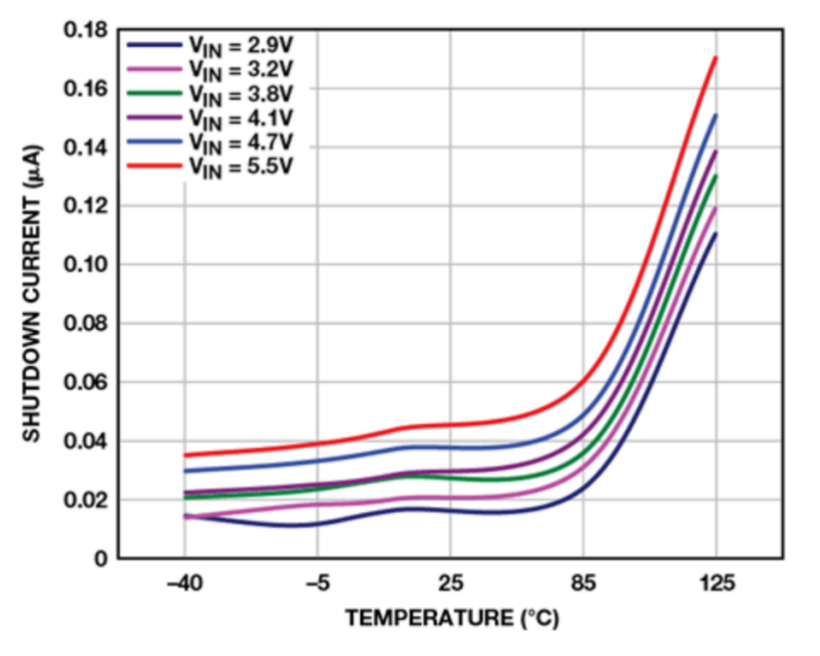 关断电流指输出禁用时LDO消耗的输入电流。参考电路和误差放大器在关断模式下都不上电。较高的漏电流会导致关断电流随温度升高而增加。